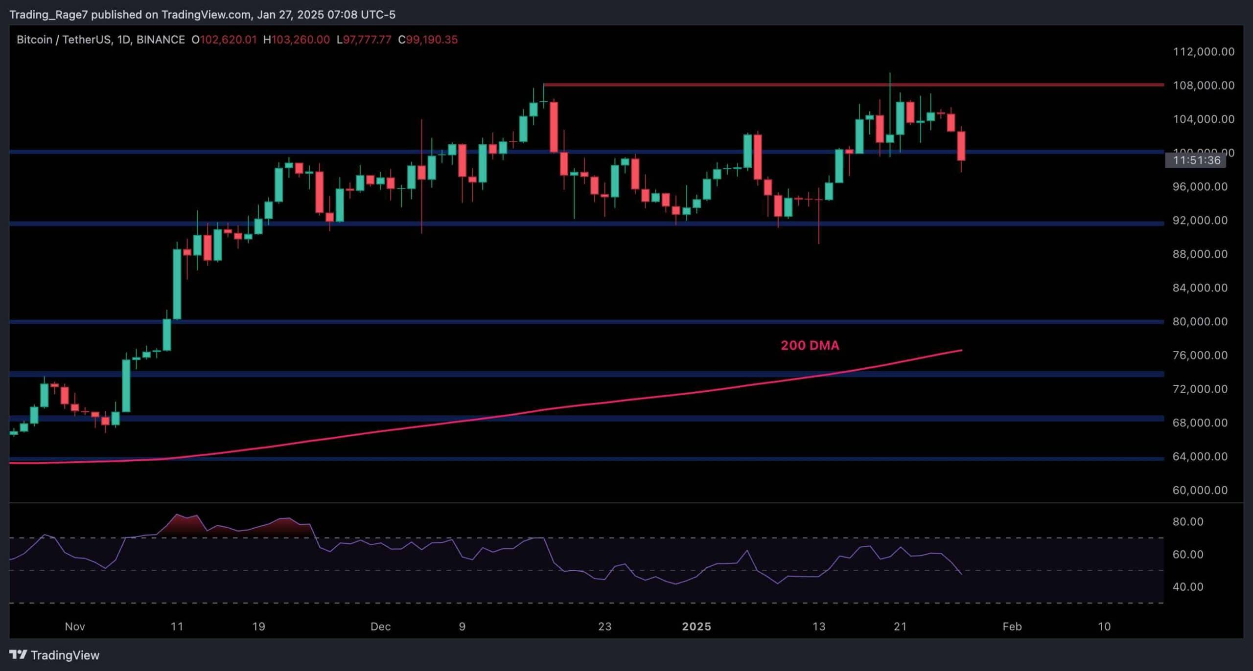 Atualmente, o preço está quebrando o nível de US $ 100 mil para a desvantagem, o que pode resultar em uma queda mais baixa em direção à área de US $ 92 mil nas próximas semanas. Com o RSI também caindo abaixo de 50%, o momento no gráfico diário é de baixa e sugere que uma correção deve ocorrer a curto prazo.