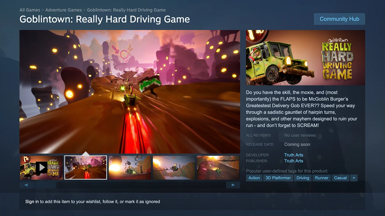 Goblintown: jogo de direção muito difícil é um título de Driving de ação para um jogador, definido para ser disponibilizado no PC via Vapor e o Loja de jogos épicos em 2025.
