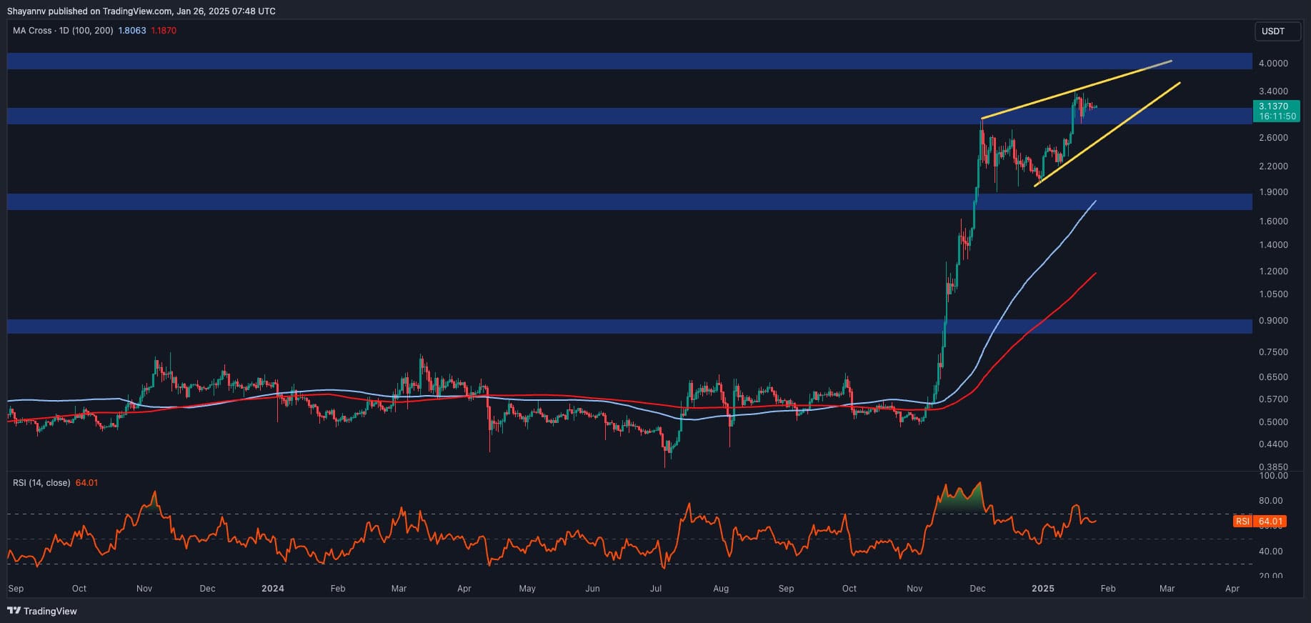 Embora a rejeição e a consolidação temporárias estejam provavelmente com essa resistência, o forte momento de alta de Ripple sugere uma possível fuga acima da marca de US $ 3,4 em perspectivas mais amplas. Tal movimento abriria o caminho para uma nova alta de todos os tempos.